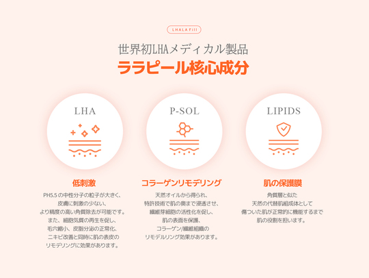 ララピールは、世界初のLHA(リポヒドロキシ酸)と特許成分:P-Solを結合した唯一のピーリングです。肌の深層(基底層)までゆっくりと浸透し、肌の内部から再生を促進させます。