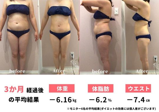 驚異のダイエット成功率​​!3か月で平均-6.2㎏のダイエットプログラム。運動なし、厳しい食事制限なし、1人1人に合わせたダイエットプログラムで簡単に気軽にダイエット。