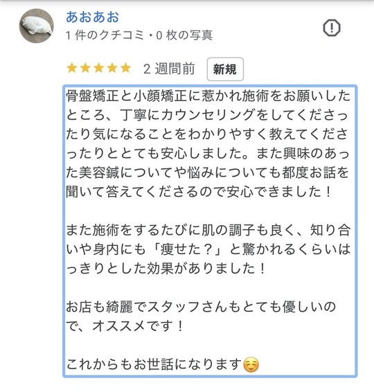 今までは笑う時に顔を隠す癖があったのですが、今ではほうれい線を気にせず笑えるようになったので本当に感謝しています。