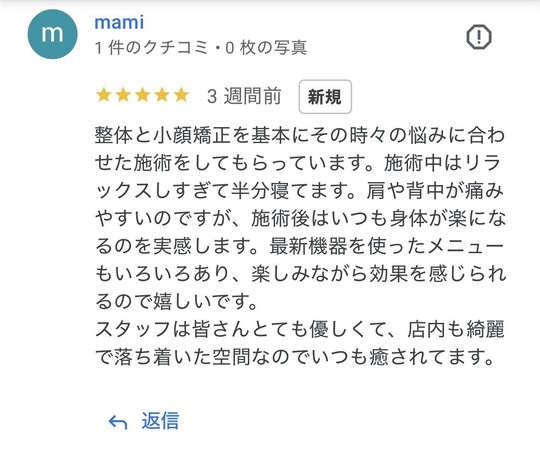 施術も心地よく、1回で姿勢がだいぶよくなりビックリしました。