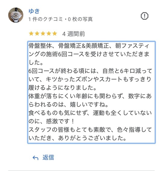 産後の身体の状態を丁寧に説明して頂き、体重を戻すためのアドバイスをして頂けたのでとても良かったです。